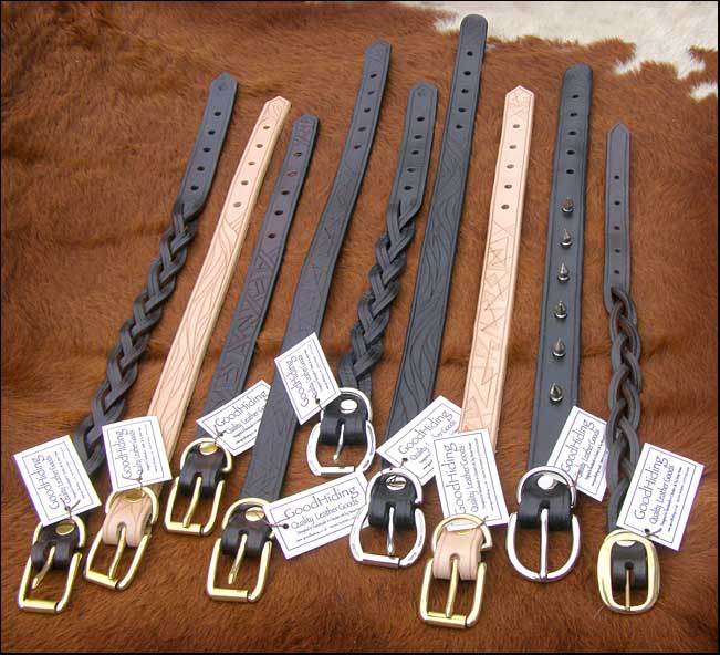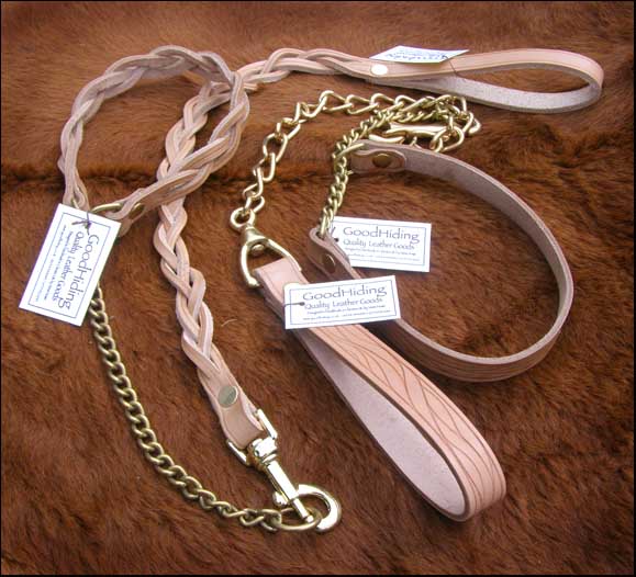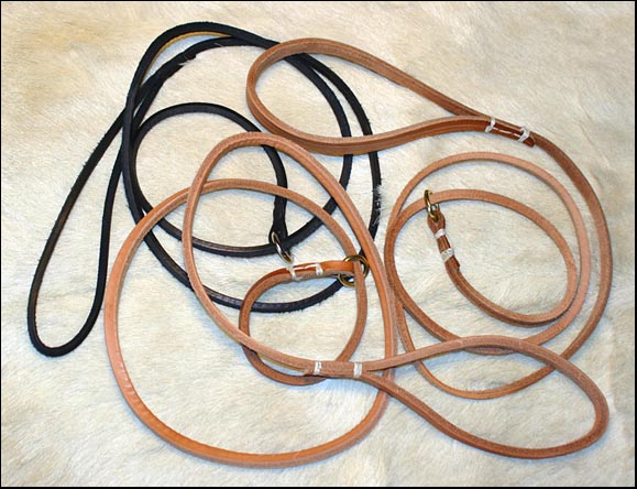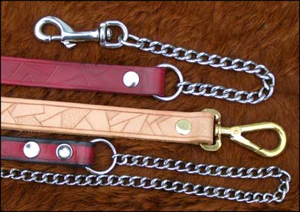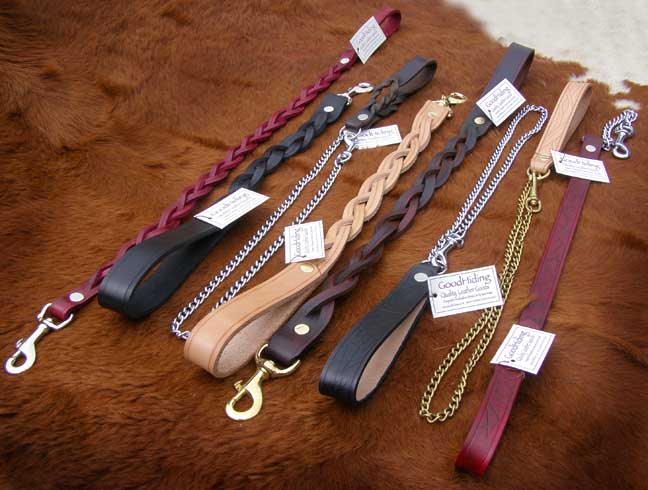 Available off-the-peg or made to measure, in a wide variety of designs and colours. They can be decorated with your best friend's name too, if you wish! In addition to the heavier duty leads illustrated here, I am now also pleased to be able to supply you with the much lighter exhibition leads in a range of lengths and colours, hand-stitched for strength. (illustrated at the bottom of the page). If you have a favourite, but worn-out, leather item, we will do our best to reproduce it for you. Prices start from around £15.00 inc P&P. |
