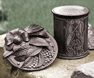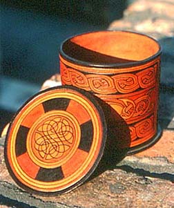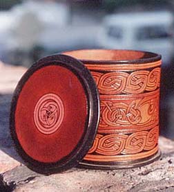 Here are a couple of my trinket boxes from over twenty years ago and long in the possession of my mother, decorated with Celtic knotwork. Below is also the lid from a larger box incorporating a 'wild rose' decoration created from small individual pieces of leather. These items, perhaps decorated with individualised names, dates ot logos, make unique and unforgettable gifts! |